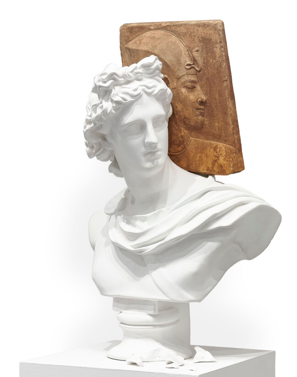The untitled piece currently on view situates, together, a plaster bust reproduction of the Apollo Belvedere (a 2nd century A.D. Roman copy of a 3rd century B.C. Greek original that depicts the deity) with a plaster cast reproduction of a low relief image of what is most likely a Pharaoh from around 400-200 B.C. Key to Wilson’s work is not only the juxtaposition of sculptures of these two figures from different cultures, but also the continually changing reception of and knowledge about both figures. The art historian Kenneth Clark (1903–1983) once remarked about the Apollo Belvedere sculpture (on permanent view at the Vatican), “…for four hundred years after it was discovered, the Apollo was the most admired piece of sculpture in the world. It was Napoleon’s greatest boast to have looted it from the Vatican. Now it is completely forgotten except by the guides of coach parties, who have become the only surviving transmitters of traditional culture.” Meanwhile, the plaque-like form that Wilson chose to juxtapose the Apollo with is of a type that is still rather mysterious to historians in terms of its use as it is a roughly formed, small-scale object whose subject, while most likely a Pharaoh or demi-god, is not defintively known.