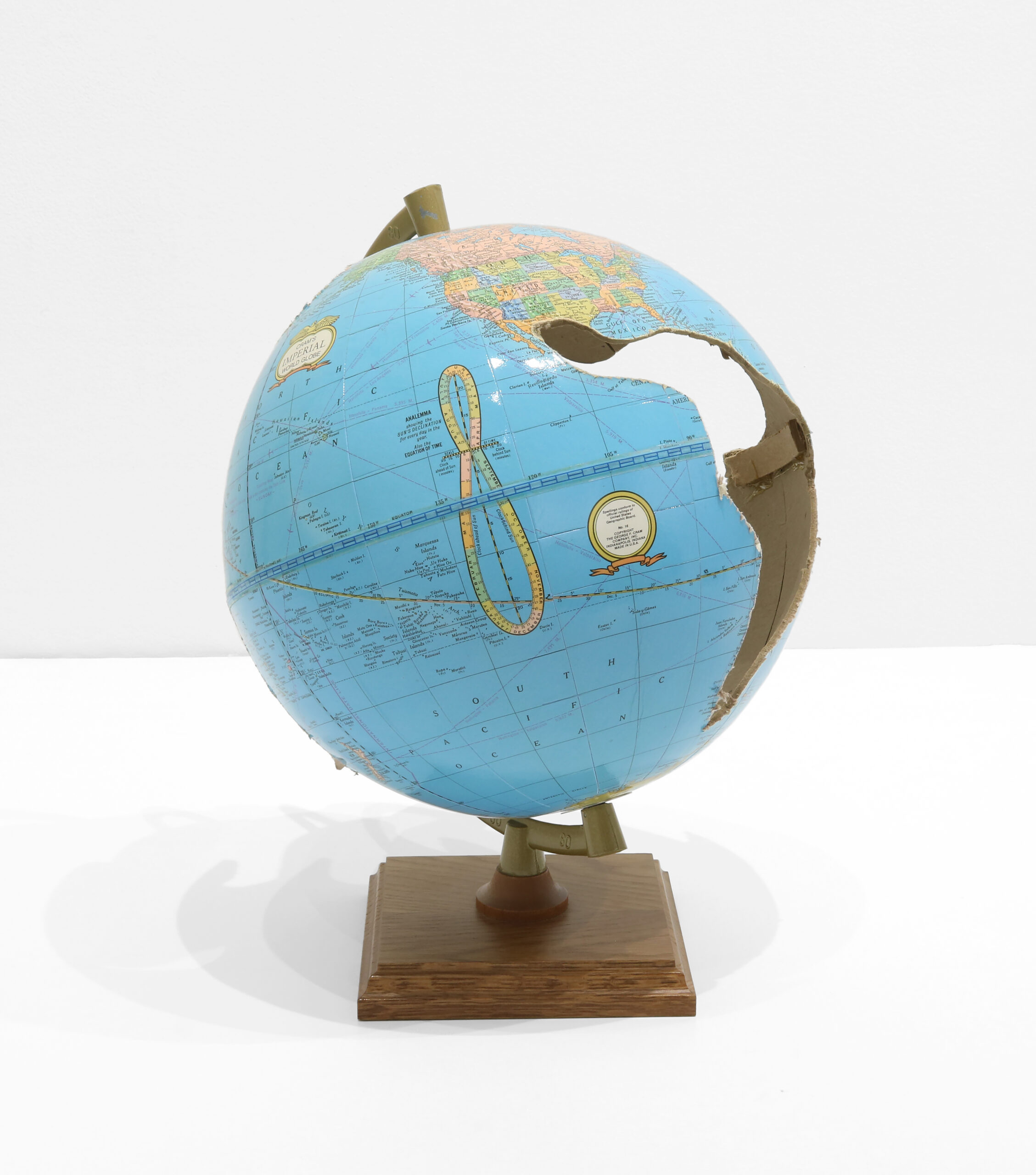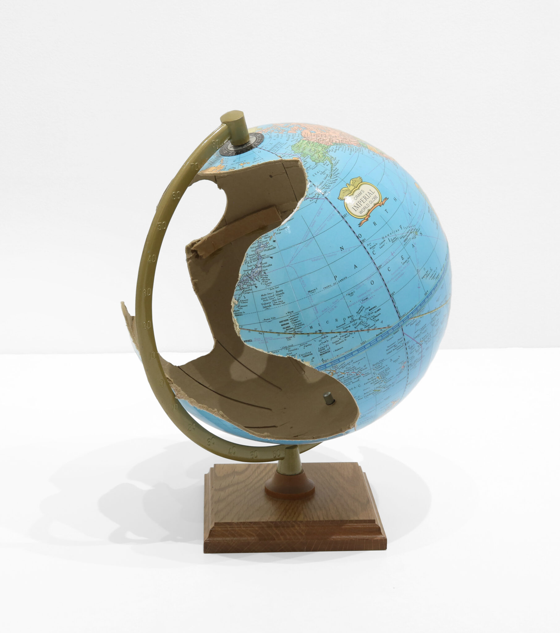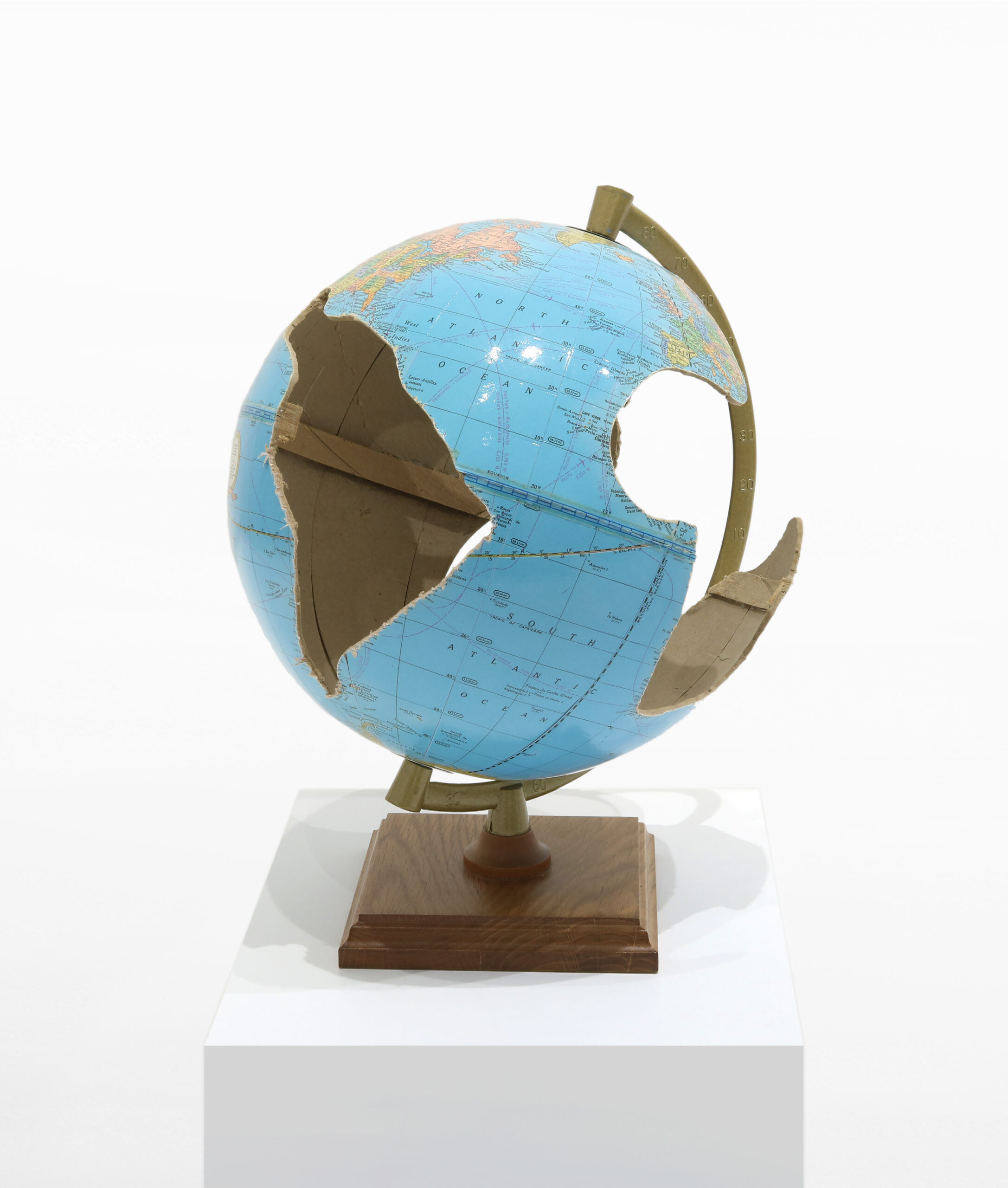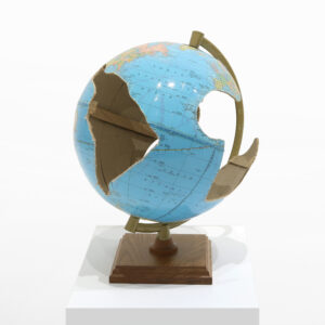 For “Art World” (1994), Wilson has taken a found globe and selectively removed Latin America, Eastern Europe, Africa, and most of Asia. Wilson has stated, “At this point I had sort of shifted it because it was really about that time and that the art world was only the United States and Europe, and all these other places were just not there.” The art, though, is not just highlighting the absence, but what happens to the globe with that absence. The physical changes to the found object reveal to the viewer a thin structure supporting an incomplete, warped shape that one can see through but can no longer rotate smoothly. These are changes to the object that are both physical alterations and also serve as lenses with which to see the metaphorical ramifications of a limited “art world.”