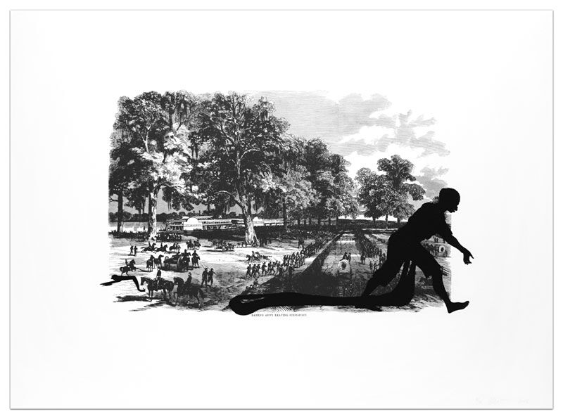 “Bank’s Army Leaving Simmsport from Harper’s Pictorial History of the Civil War (Annotated)”, utilizes imagery of the 19th century “Harper’s Pictorial History of the Civil War” and, in Walker’s titling, “annotates” the images with her own additions. These additions create a more rounded picture of who was involved in this civil war-era scenario. The use of simplified, stereotypical silhouettes further complicates the scenario, as they are forms that do not have any detail and thus don’t accurately represent the individual (thus adding cartoonish, derogatory illustrations to a pre-existing and equally inaccurate representation of what happened in the Civil War).