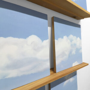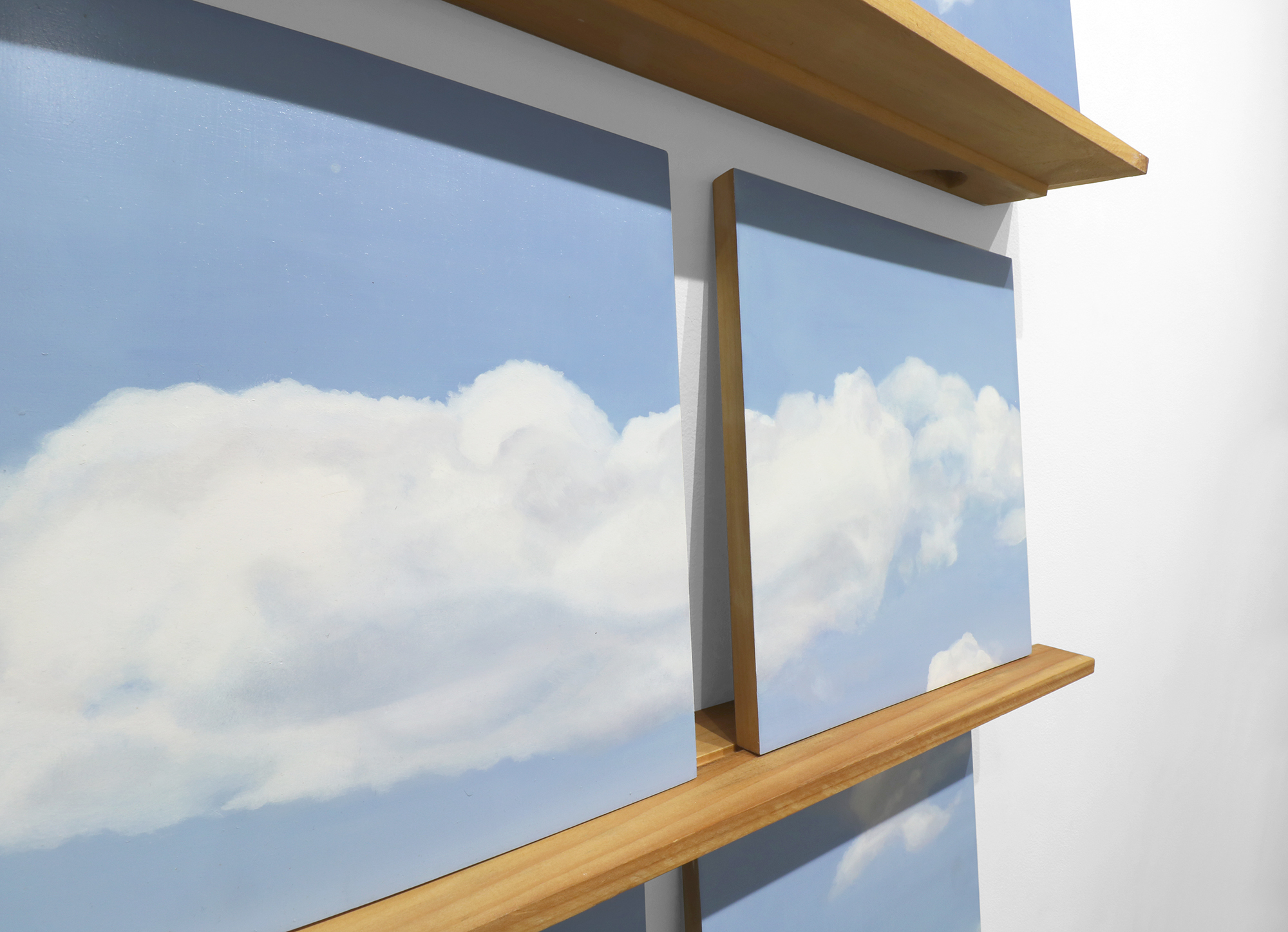 Six poplar panels (11 x 11 inches each) with oil paint, three pine shelves