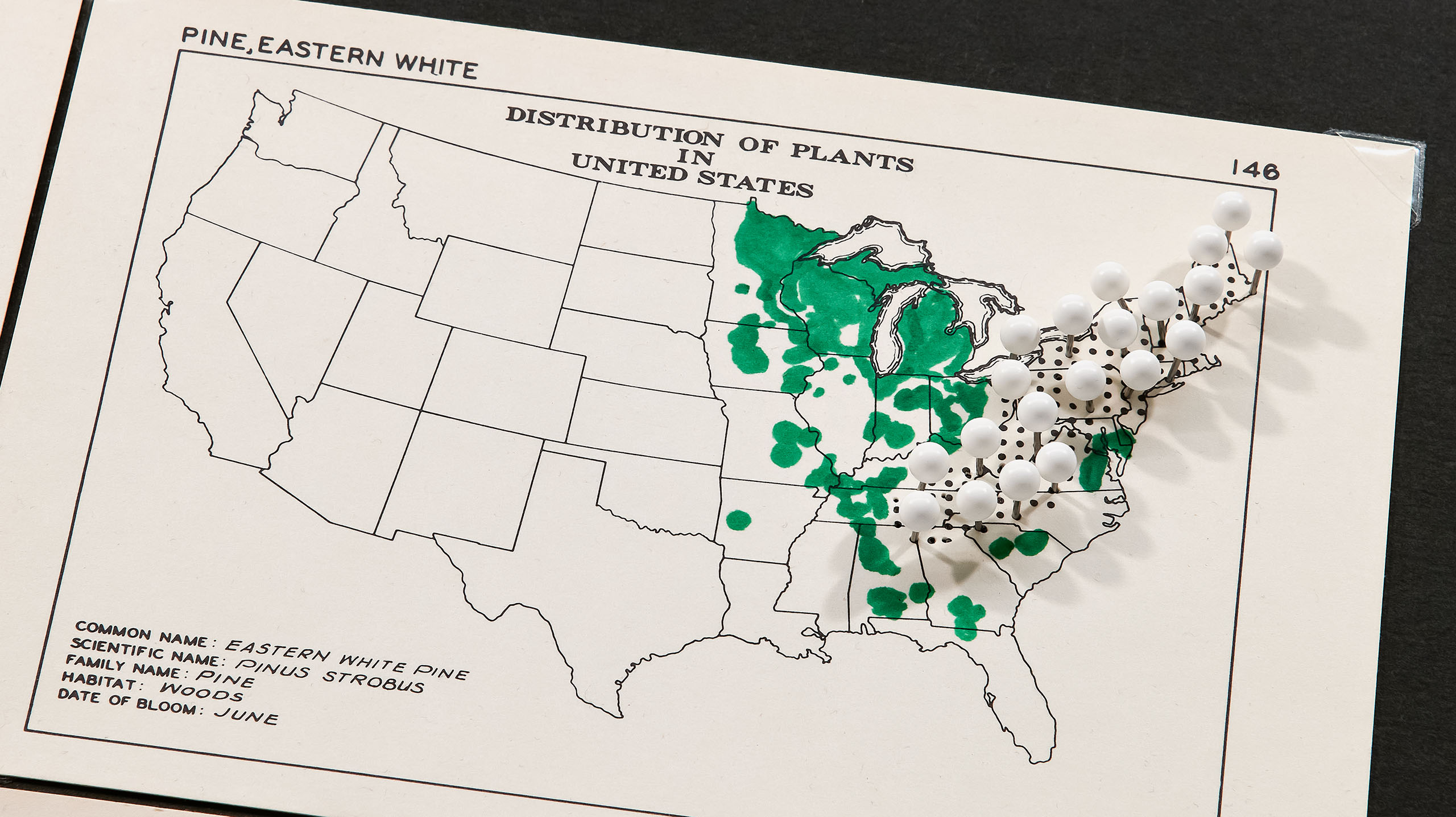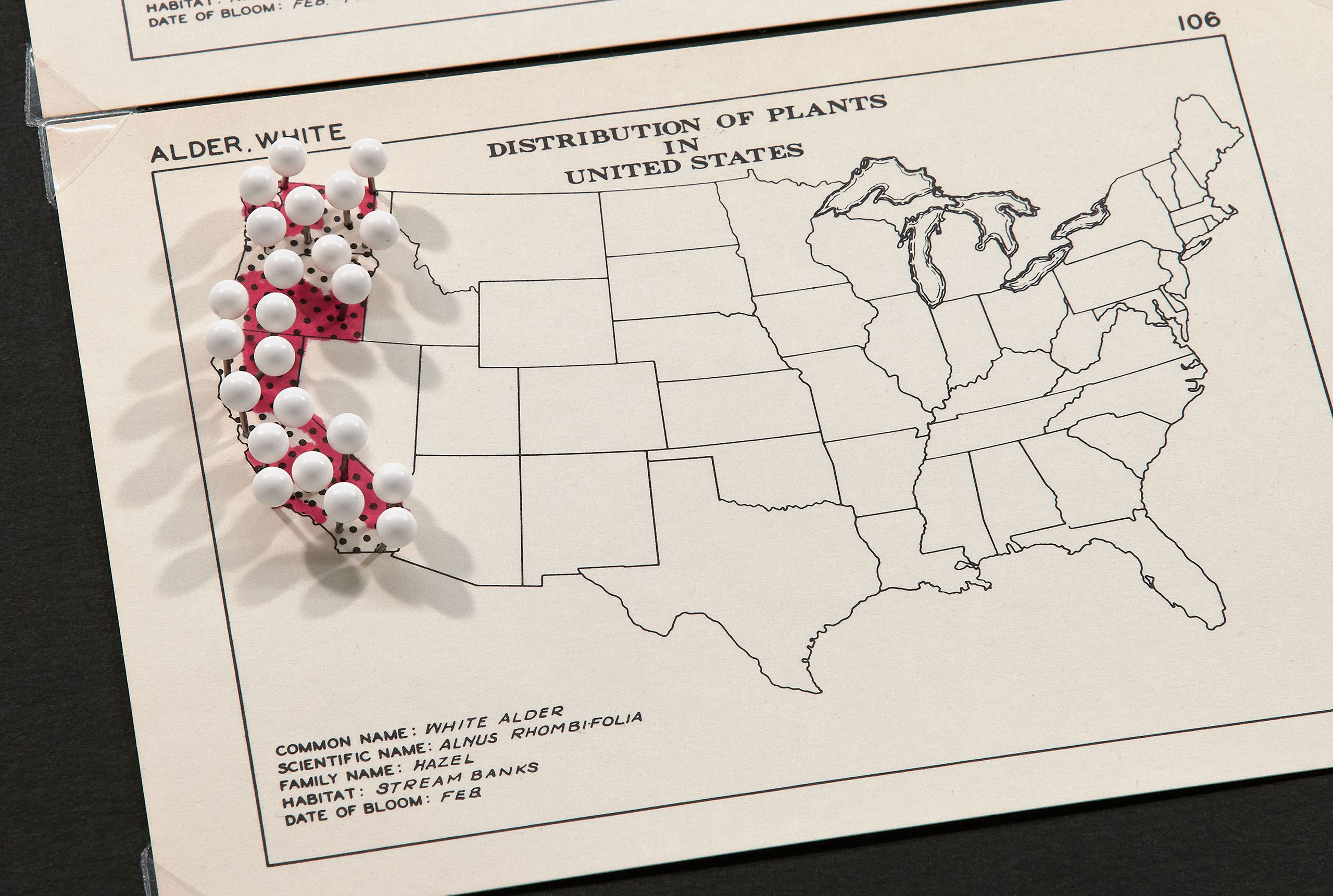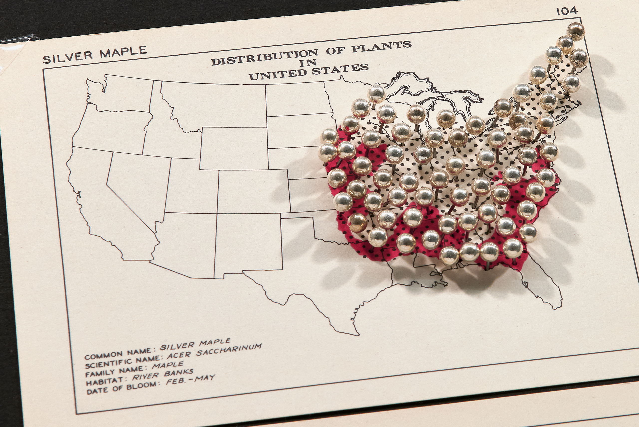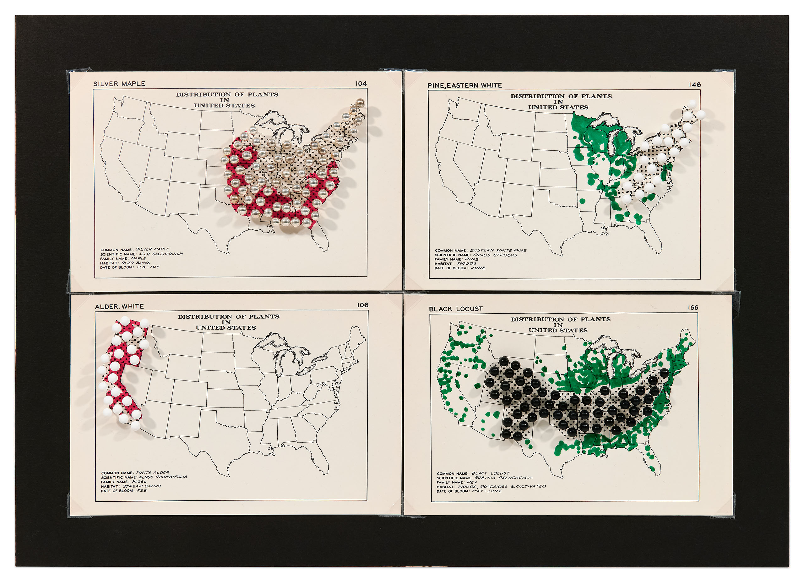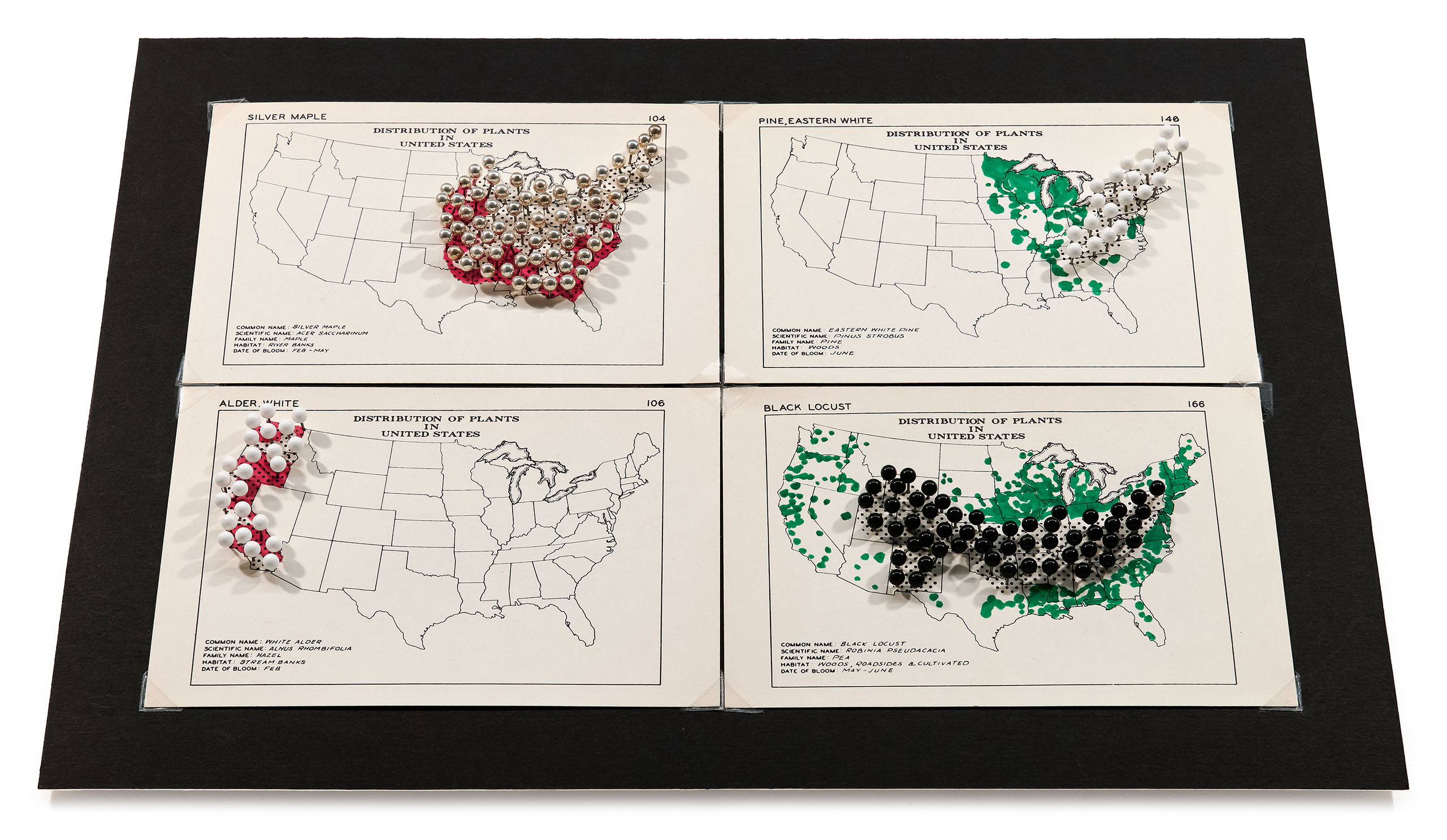 LIKE TREES (UPDATE), 2026 Rosen ran across a set of cards, used by allergists, graphically depicting maps of the distribution of trees and grasses in the United States. The artist elevated the map to a 3-D diorama with colored map pins to approximate trees. The maps have changed since they were created in the 1950’s. The trees have either receded or expanded in their geographical zones. They have been re-coded here in red or green ink by the naturalist Lindsay Neubeck-Brooks to reflect their current status. According to Rosen, the main thing that distinguishes LIKE TREES (UPDATE) from a science project is art, or more precisely, color, making the piece a visual object devoid of any scientific information. The colored map pins are matched to the tree names – Silver Maple, White Alder, Black Locust, and Eastern White Pine – turning aerial views of black dots into miniature landscapes.