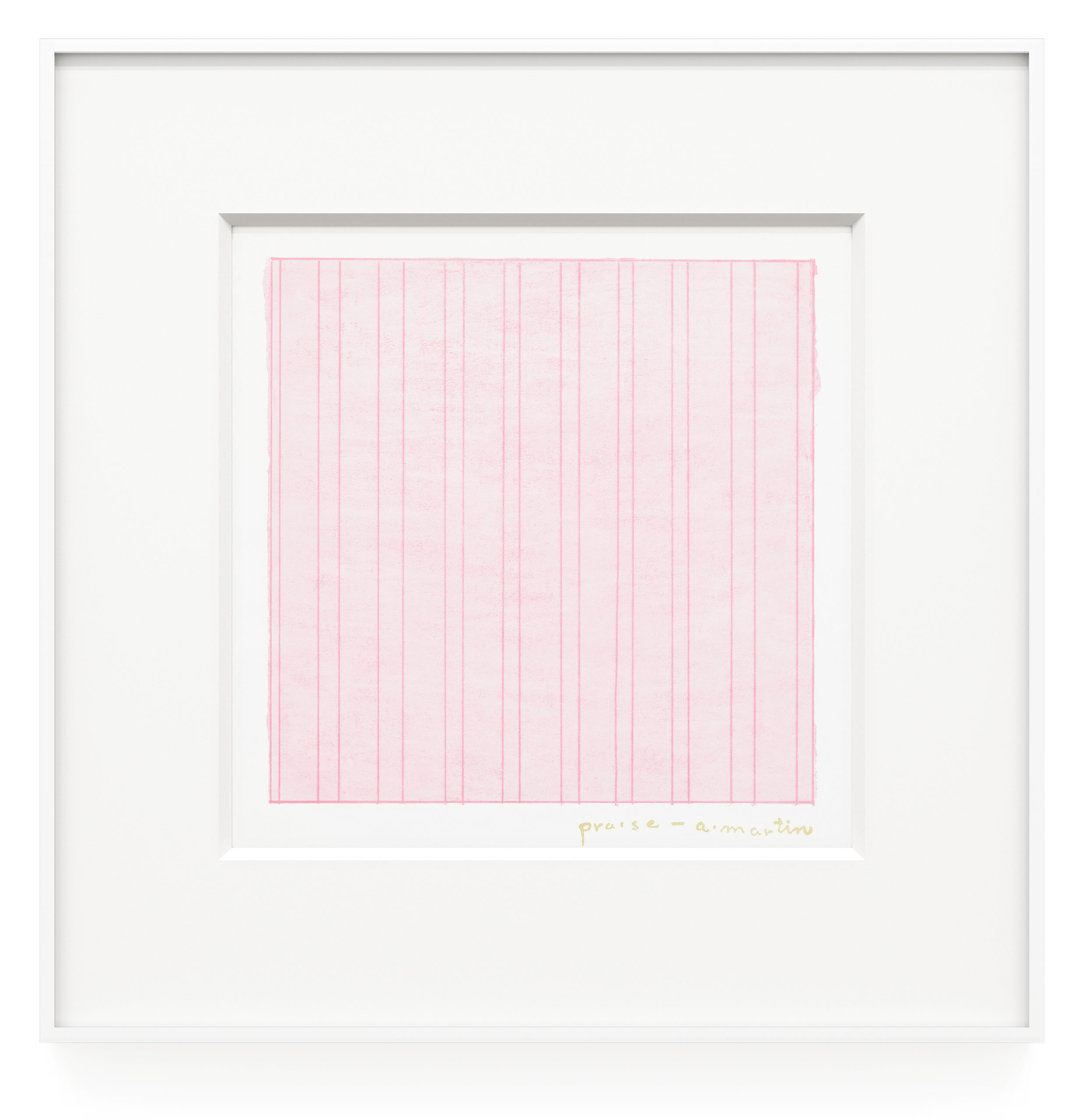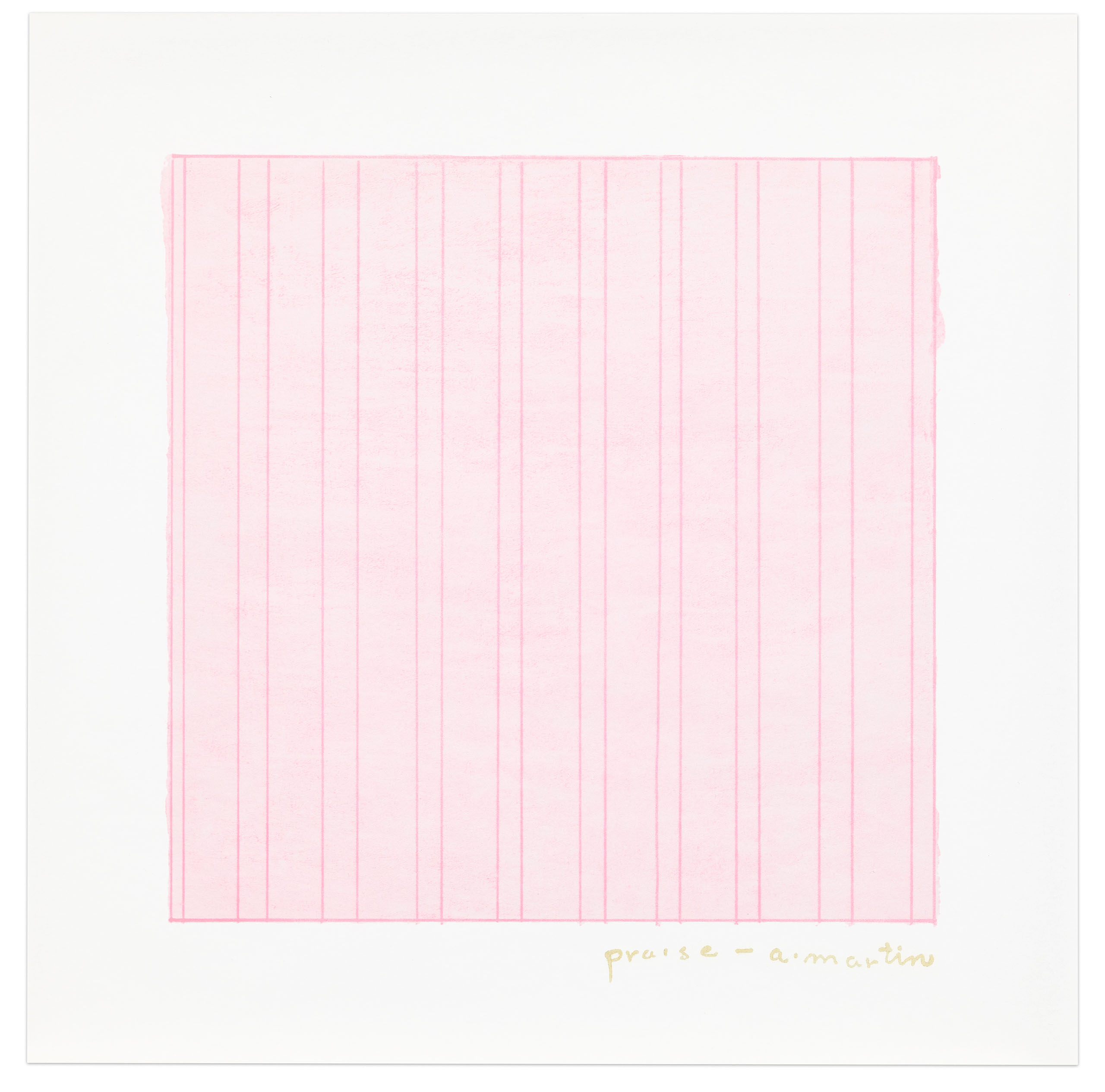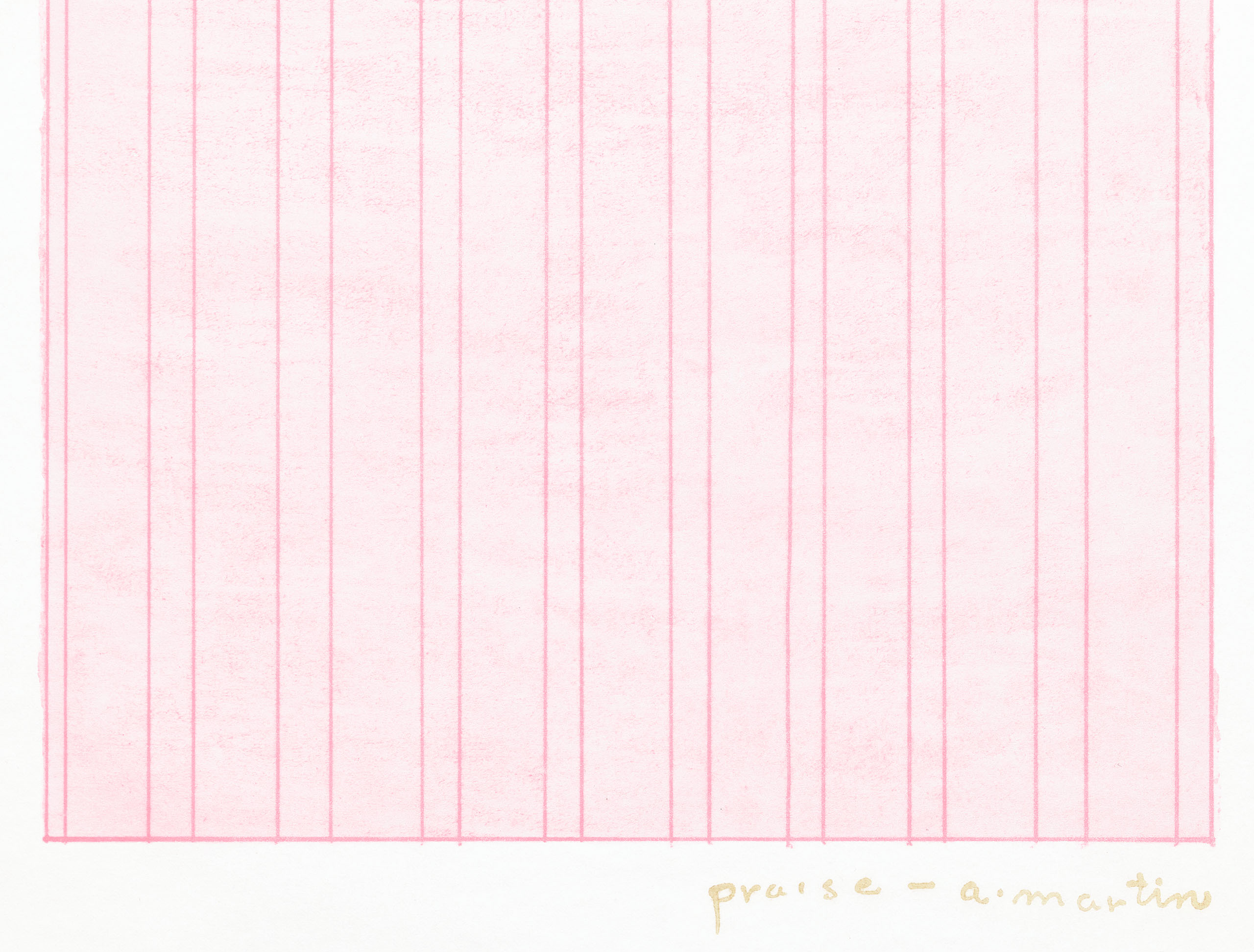 Unlike any other participant in the project, Martin’s contribution was unable to be printed as a rubber stamp in a way that would satisfy the artist. With the guidance of Aaron Arnow (the printer who worked most closely with Parasol on the whole project), Martin’s work was printed as a collotype so as to capture the subtlety that she wanted.