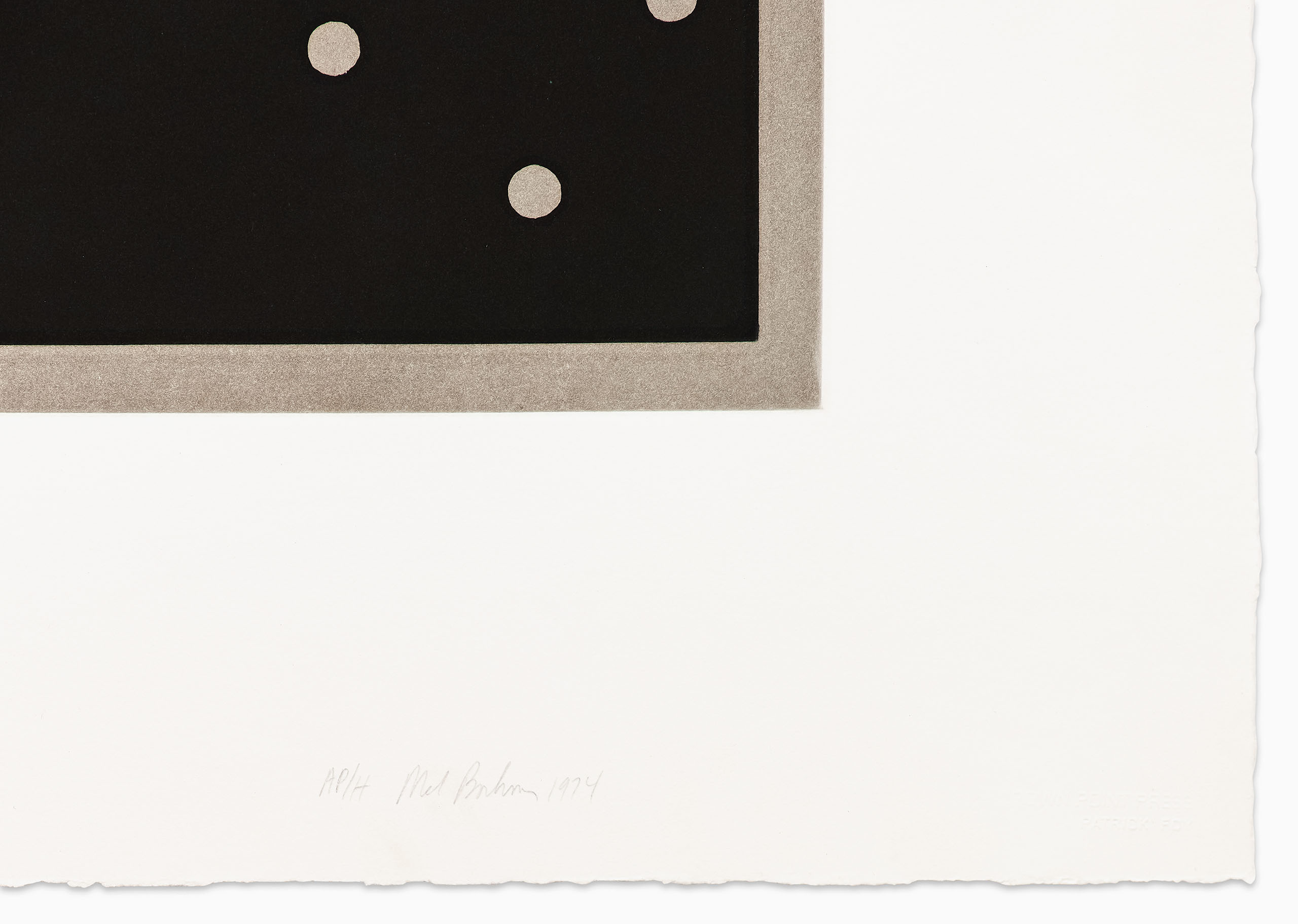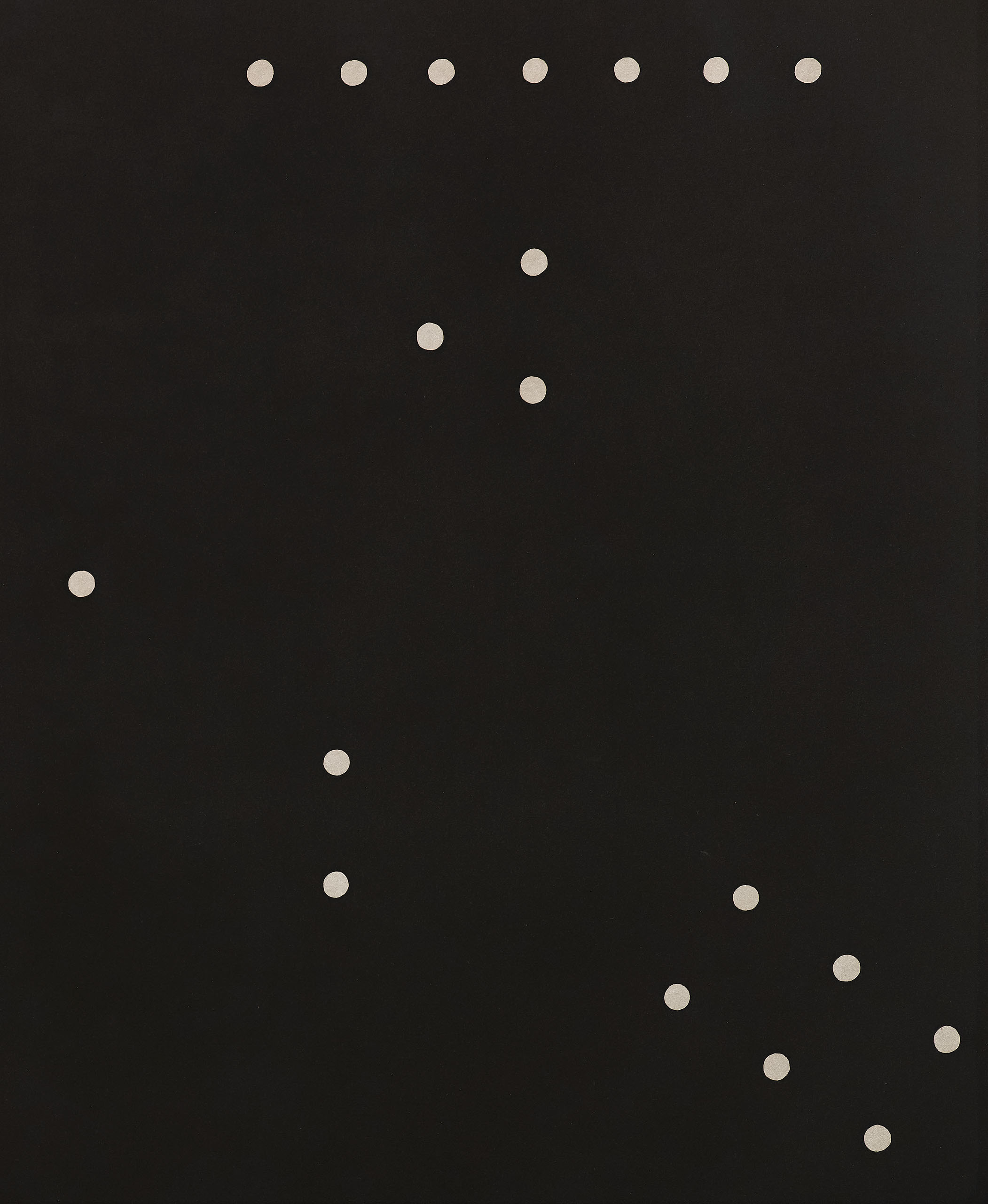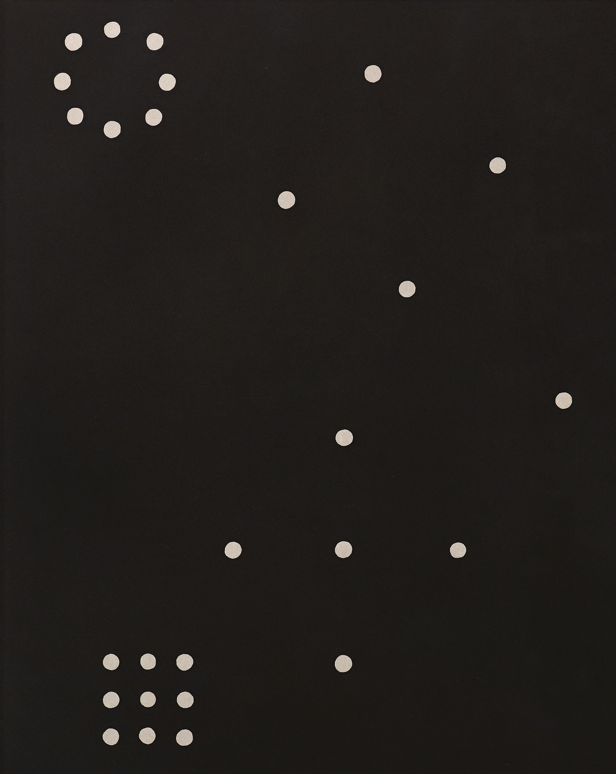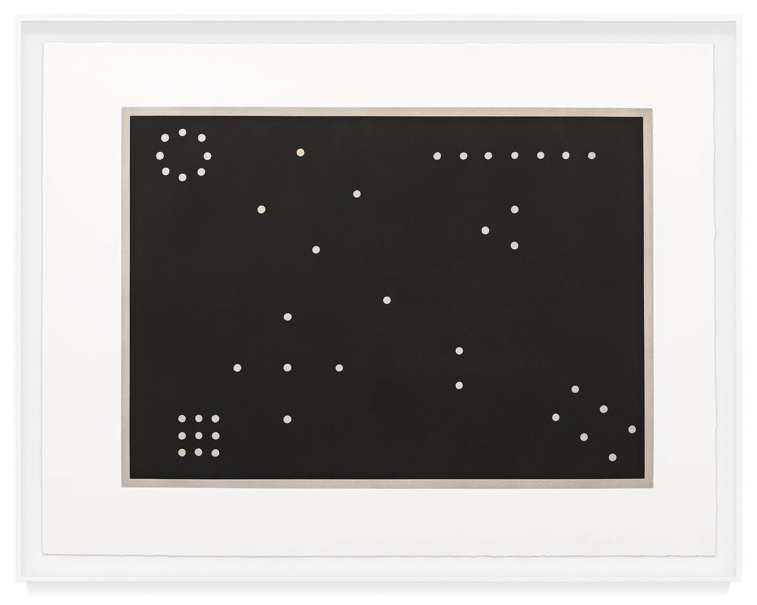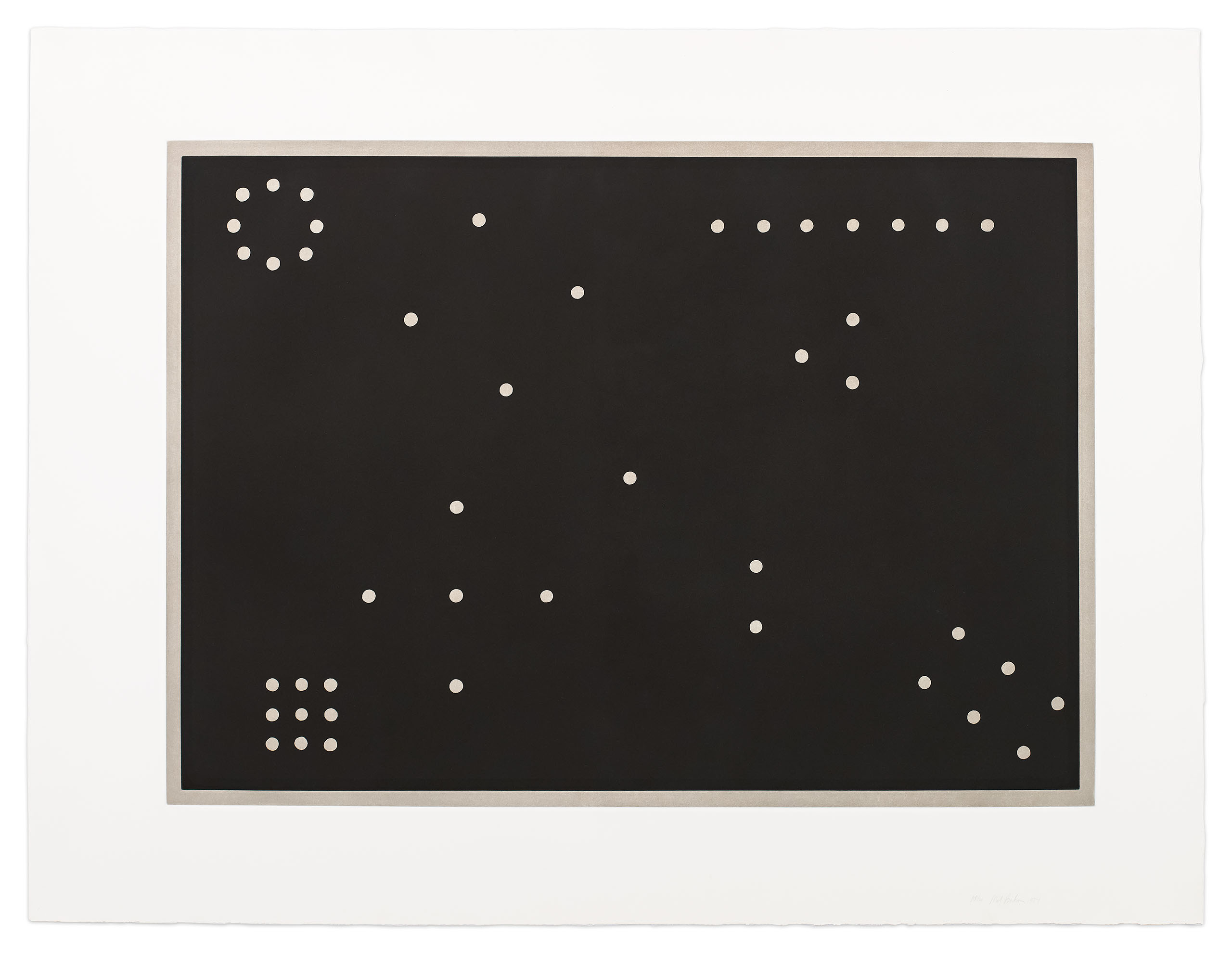 “This two-color aquatint “Rules of Inference”, is based on the floor plan of an installation of one of my sculptures made of small stones. If you start with the single dot in the center and spiral around counter-clockwise you will see the configurations of dots progress from one to nine.”
