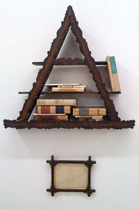Books, bookshelf, typewriter ink on paper in frame