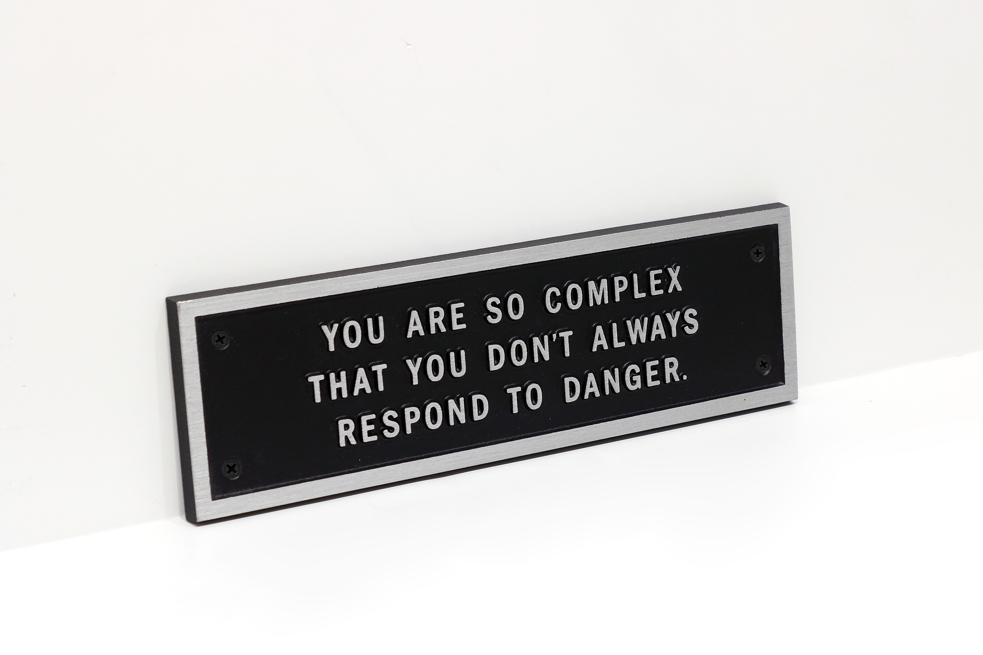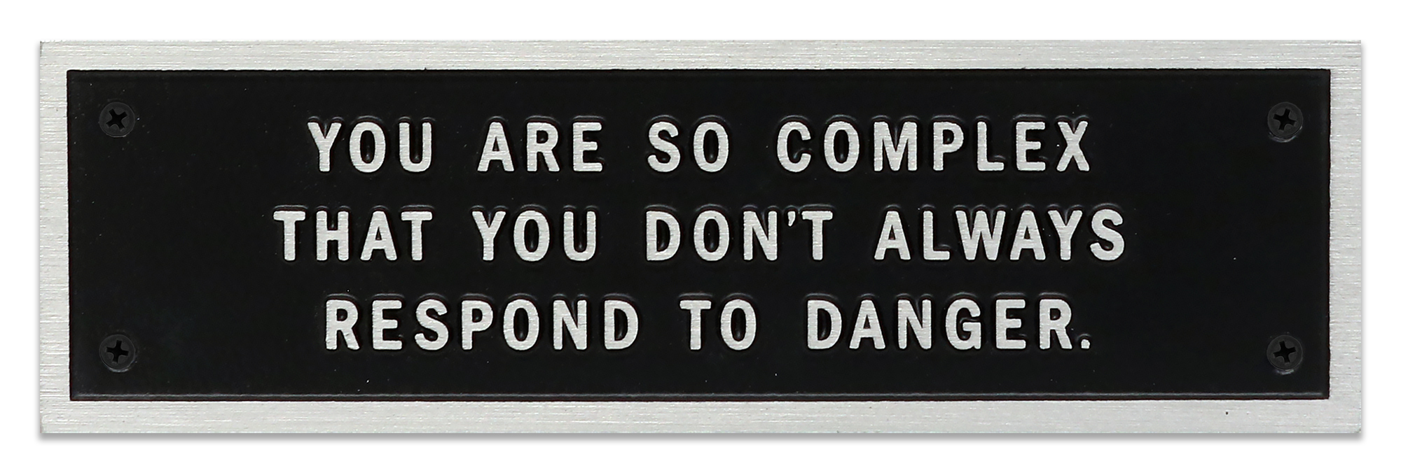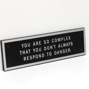 “Survival,” is a cautionary series whose sentences instruct and inform while questioning the ways individuals respond to their political, social, physical, psychological, and personal environments. The tone of “Survival” is more urgent that that of the prior series, “Living.” Survival was the first of Holzer’s text series to be written especially for electronic signs; the sentences are short and pointed so as to be easily accessible to passersby. The artist soon thereafter began presenting her “Survival” on cast metal plaques. These plaques mimic the permanent labels that appear on historic buildings, taking advantage of the authority of this familiar format to surprise readers with warnings, directions, and quiet observations.