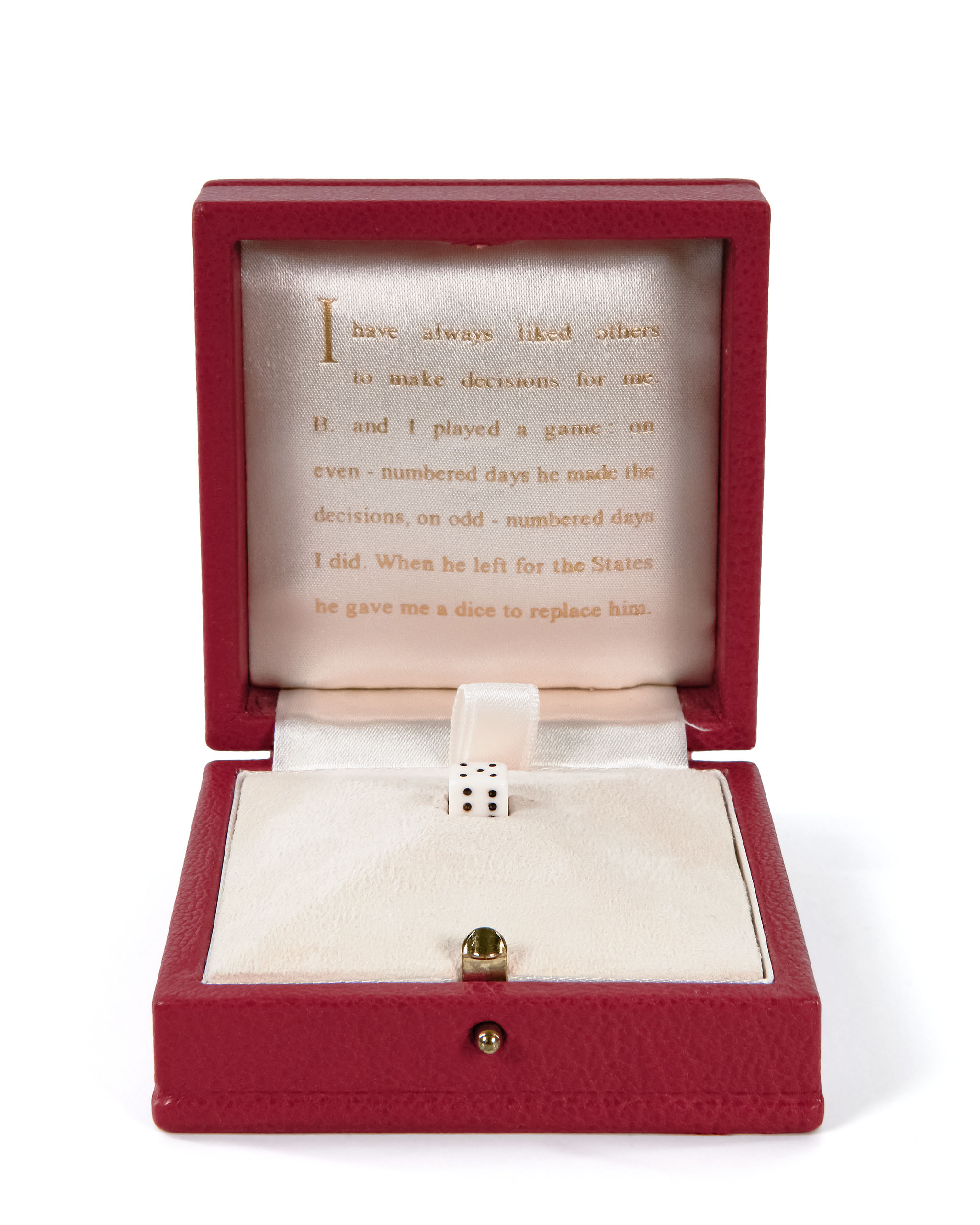 “I have always liked others to make decisions for me. B. and I played a game – on even-numbered days he made the decisions, on odd-numbered days I did. When he left for the States he gave me a dice to replace him.”