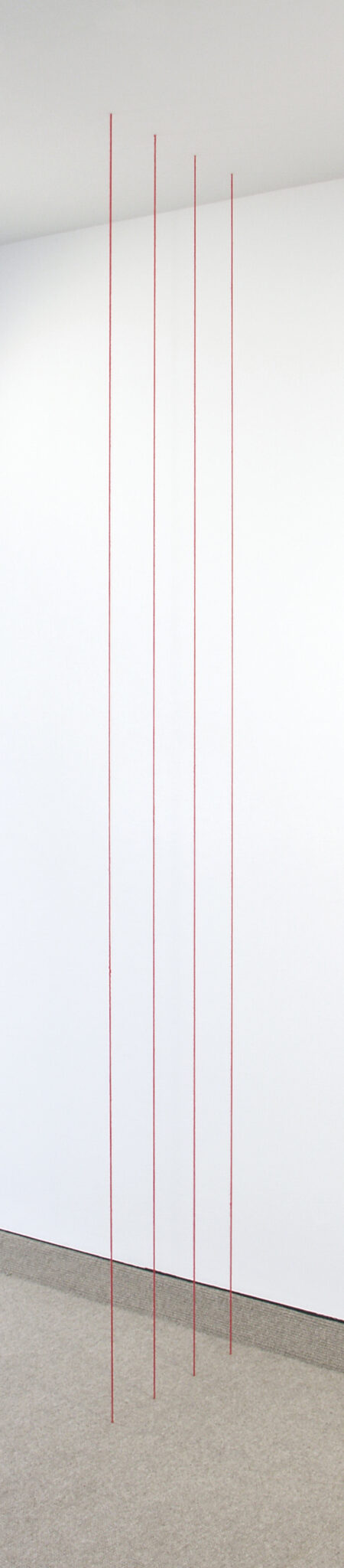 (The sculpture consists of four lengths of red acrylic yarn stretched vertically between floor and ceiling. The space between the wall and the first line, and spaces between the lines themselves is 6 inches (15.2 cm) in each instance. The lines are perpendicular to the adjacent wall.)
