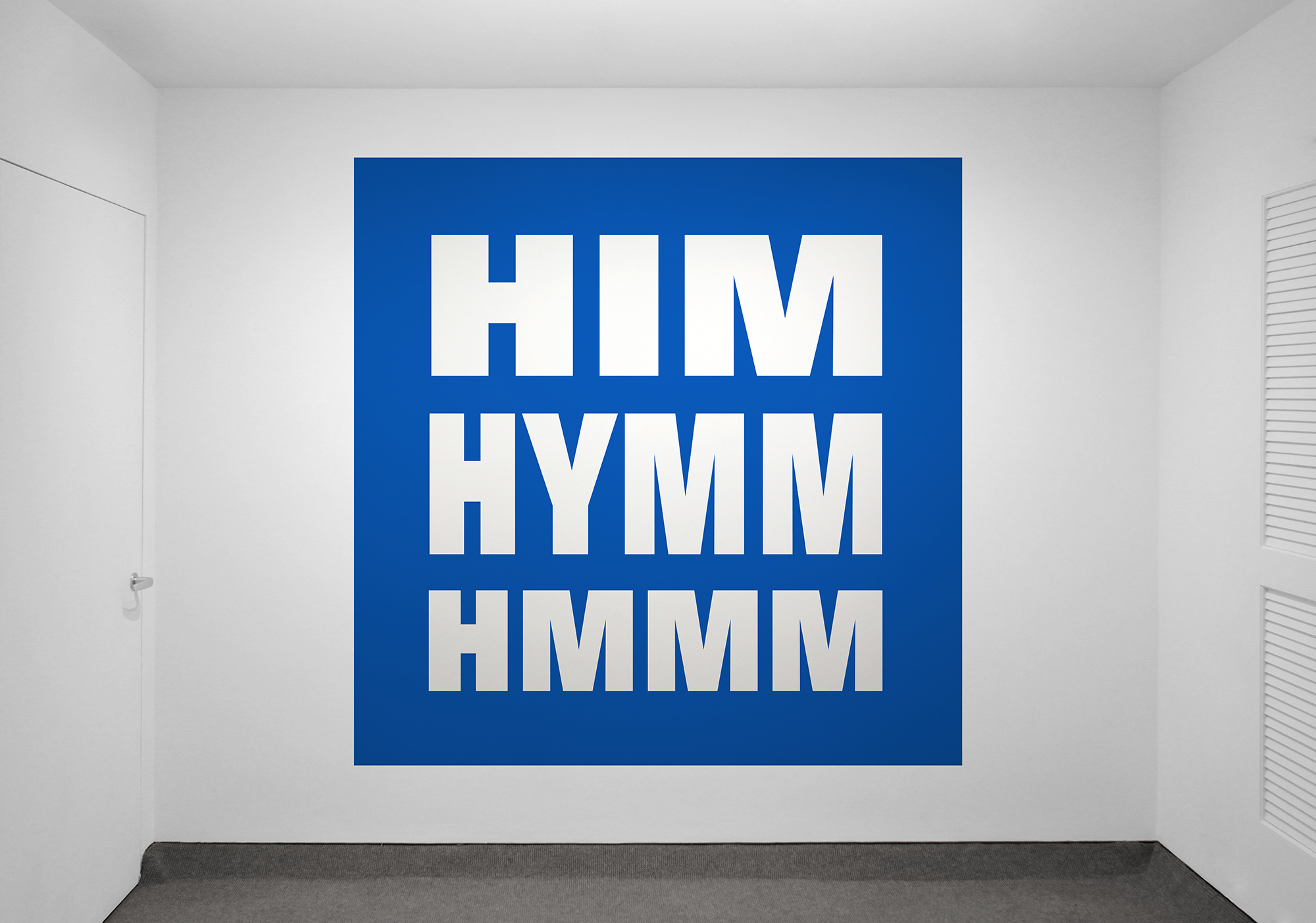Kay Rosen’s “Various Strata” was first made in 1985 when the artist was exploring how margins affect the reading and understanding of text. As a nonlinear stacked painting, it had a natural top-down order, which was also the message of the text: a hierarchy representing male patriarchy at the top (HIM), followed by two levels below: HYMM (misspelled intentionally) which expresses paeans and devotion to HIM, and thirdly, HMMM, indicating doubt and equivocation. Any number of specific situations can be substituted for the generic male personage and his followers, including our present-day situation.
