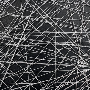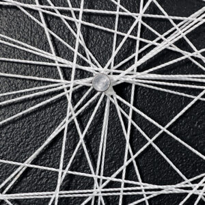 For this iteration of One Wall, One Work, the gallery presents Wall Drawing #815, a work that has not been photographed previously. Wall Drawing #815 harkens back to one of the earliest Wall Drawings – Wall Drawing #51 (All architectural points connected by straight lines) which was made with blue snap lines. Like its predecessor, Wall Drawing #815 can be installed on any size wall, but #815 consists of thirty randomly placed points marked by nails, connected to one another via white string, all on a black wall.