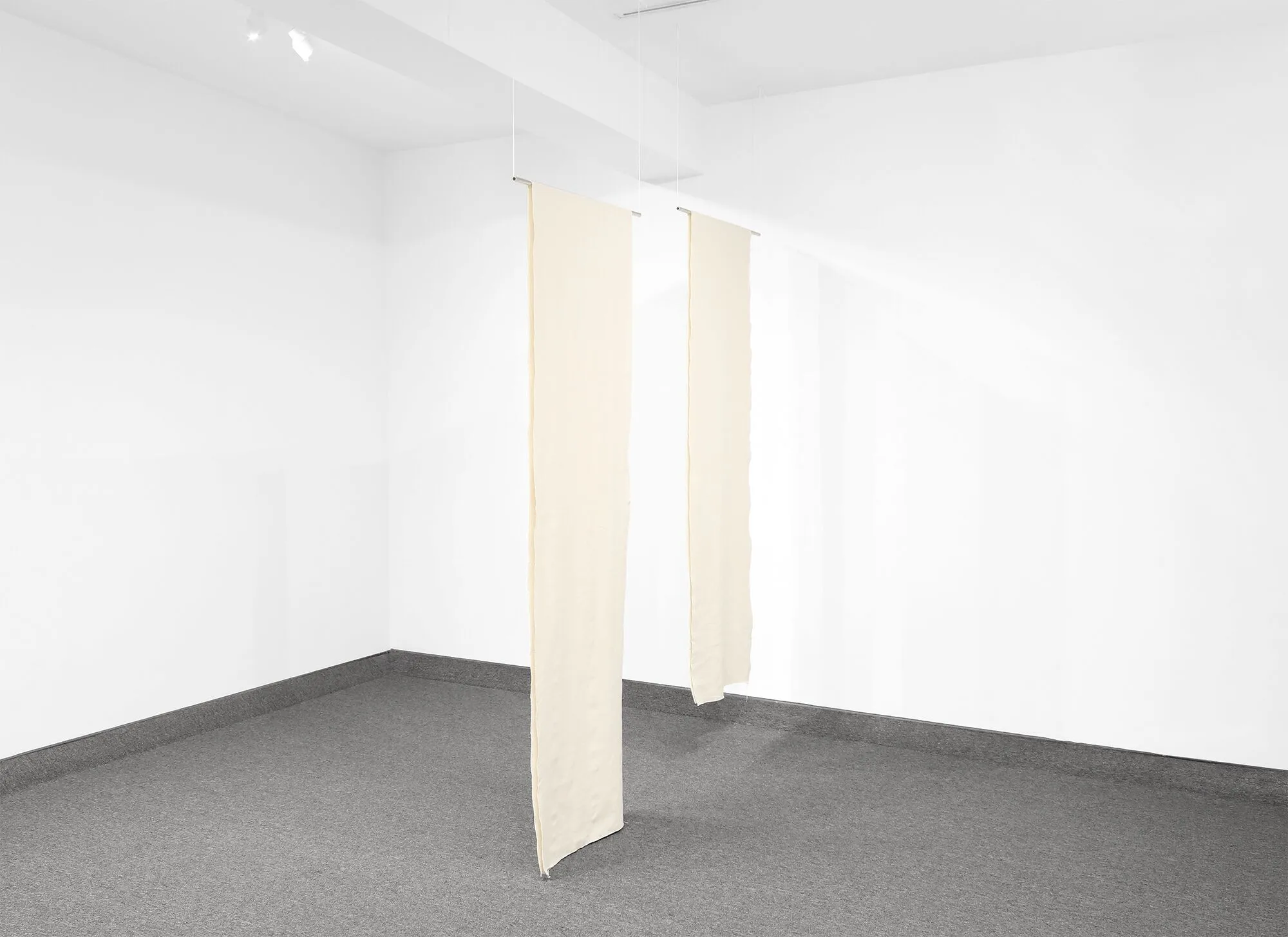 Hand-woven cotton draped on aluminum rods, hung from cotton string, all arranged in a room