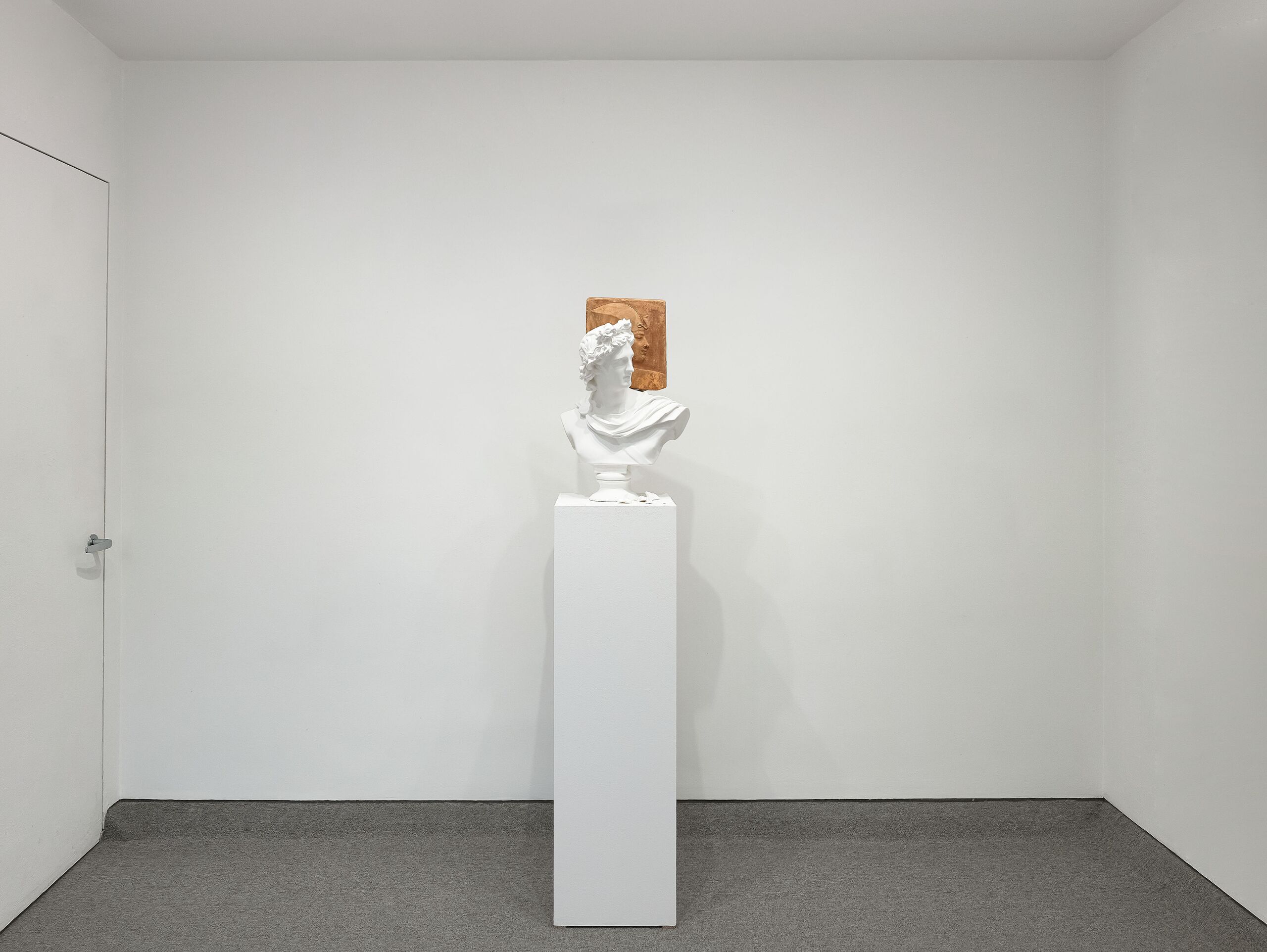 The untitled piece currently on view situates, together, a plaster bust reproduction of the Apollo Belvedere (a 2nd century A.D. Roman copy of a 3rd century B.C. Greek original that depicts the deity) with a plaster cast reproduction of a low relief image of what is most likely a Pharaoh from around 400-200 B.C. Key to Wilson’s work is not only the juxtaposition of sculptures of these two figures from different cultures, but also the continually changing reception of and knowledge about both figures. The art historian Kenneth Clark (1903–1983) once remarked about the Apollo Belvedere sculpture (on permanent view at the Vatican), “…for four hundred years after it was discovered, the Apollo was the most admired piece of sculpture in the world. It was Napoleon’s greatest boast to have looted it from the Vatican. Now it is completely forgotten except by the guides of coach parties, who have become the only surviving transmitters of traditional culture.” Meanwhile, the plaque-like form that Wilson chose to juxtapose the Apollo with is of a type that is still rather mysterious to historians in terms of its use as it is a roughly formed, small-scale object whose subject, while most likely a Pharaoh or demi-god, is not defintively known.