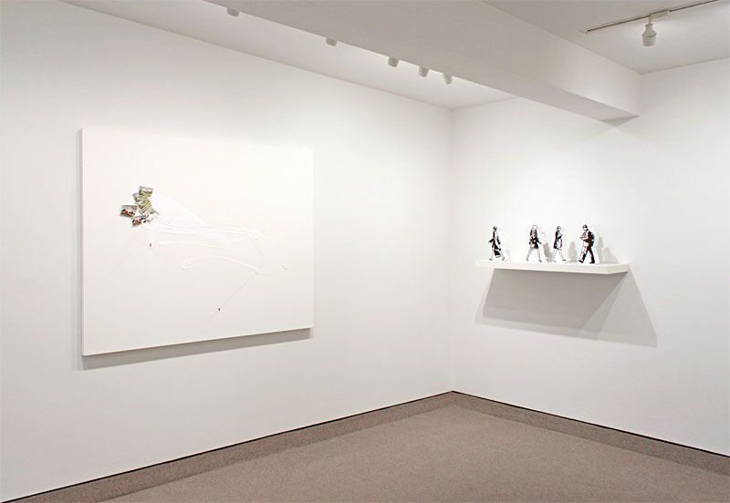 Liliana Porter’s assembled painting consists of several miniature figurines from model kits, a deck of cards with the imagery of a quaint farm in Minnesota repeated on each card, white paint that serves as adhesive, pictorial terrain, painterly ground and expressionist gesture, along with graphite lines that serve formally and narratively to connect the elements. “Untitled (with Travelers)” present viewers with the humor of childhood play, a panorama going back in time via the cards, and a vastness that can create excitement, fear, ambivalence or a sense of dauntingness, all within a 48 x 60 inch canvas.