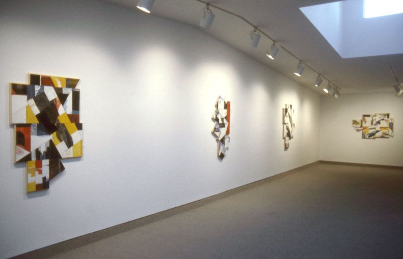 The show includes new medium-scale works of oil on shaped plywood panels–panels whose Braquian jigsaw-puzzle like internal shapes and generally bright, saturated colors and shining whites great viewers with exuberent, energetic, joyful first impressions: here and there the eye is drawn playfully across the lush, painterly surface by the jangly, non-hierarchically structured swaths of colors. Soon, however, this visual treat develops into another, in the form of the perceptual gaming Hadfield’s jigsaw-puzzle structures initiate. The artist subjects his neatly composed geometric pieces to discrete shifts, small geological rifts in the paintings’ surfaces that slowly transform the their implicit stability into an arena in which every juxtaposition of color and form poses a new question. Even the implied rectangular limits of painting aren’t spared–the artist’s subtle notches and more overt projections clearly push the visual discussion outside and beyond that reified rectangle. Colors, shapes, lines are continued or discontinued abruptly across these rift zones, to disappear or be continued elsewhere, in a seemingly endless perceptual archeology.